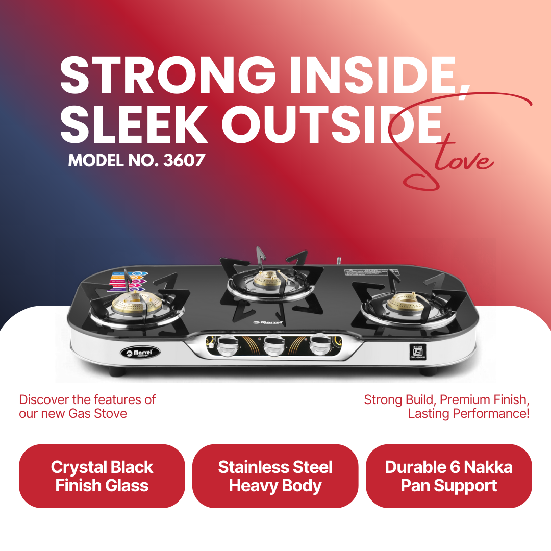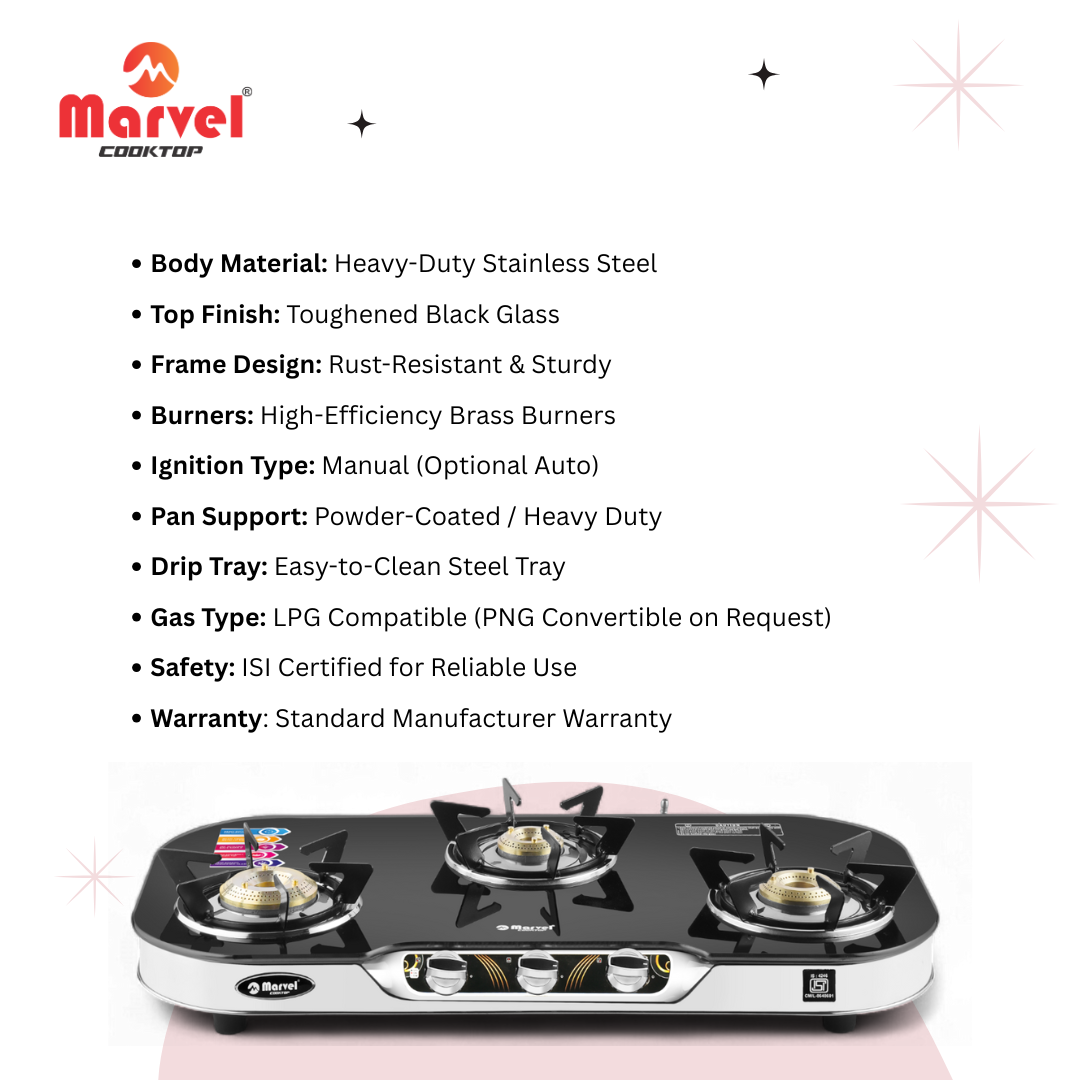 कुकटॉप मार्वल - 3 बर्नर वाला एलपीजी स्टोव, शानदार प्रीमियम क्रिस्टल ब्लैक ग्लास और सिल्वर एसएस फ्रेम के साथ। टिकाऊपन और स्टाइल के लिए प्लस बॉडी फ्रेम के साथ, यह मॉडल बेहतरीन किचन अनुभव के लिए तैयार किया गया है।