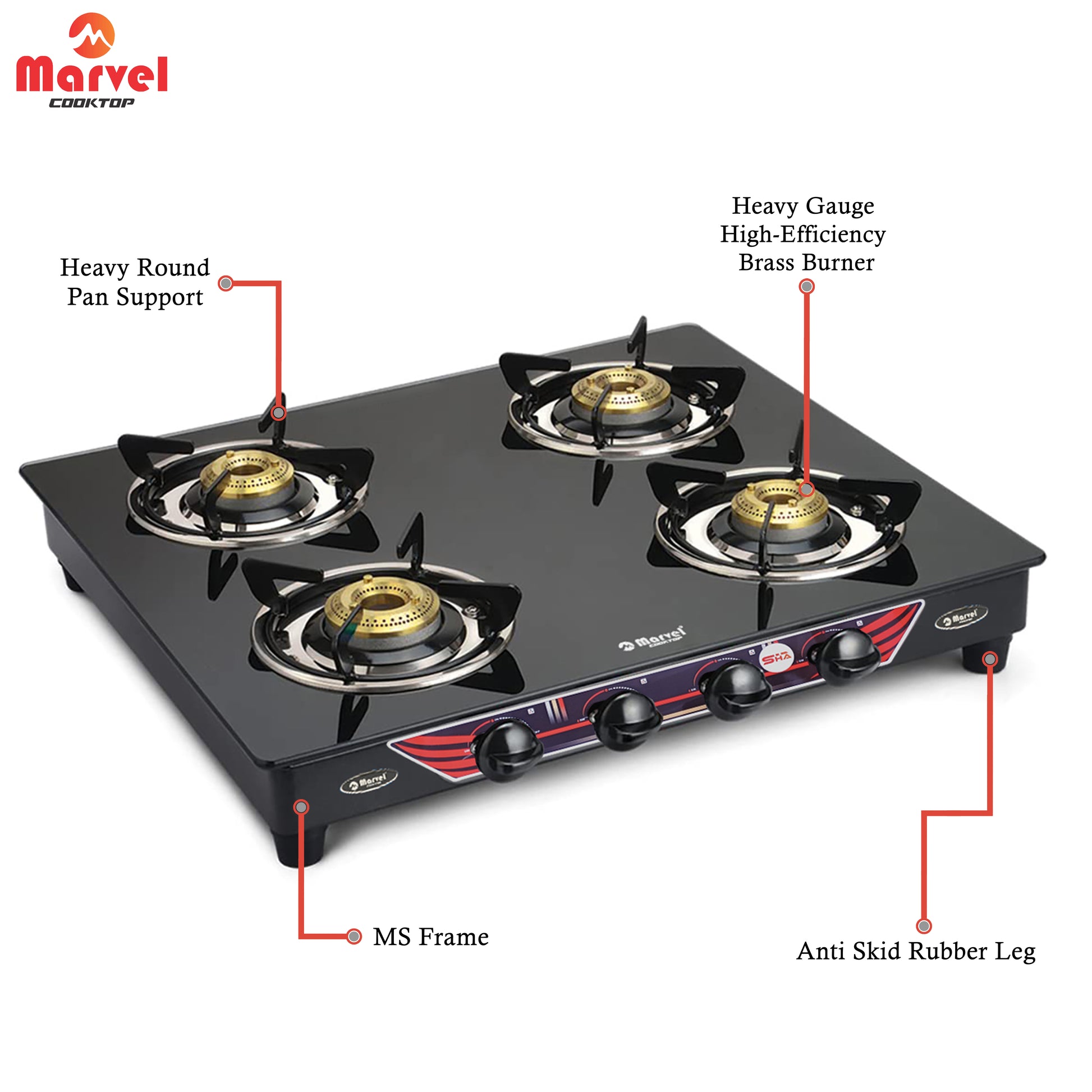 कुकटॉप मार्वल - 4 बर्नर गैस स्टोव | क्रिस्टल ब्लैक ग्लास, MS फ़्रेम | जंबो ब्रास बर्नर | मैनुअल इग्निशन, LPG कम्पैटिबल (PHASTOS MS - 4404)