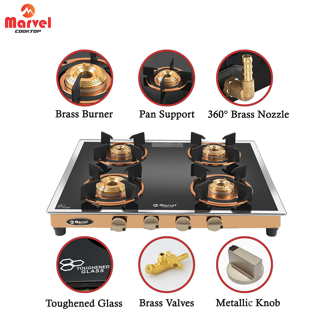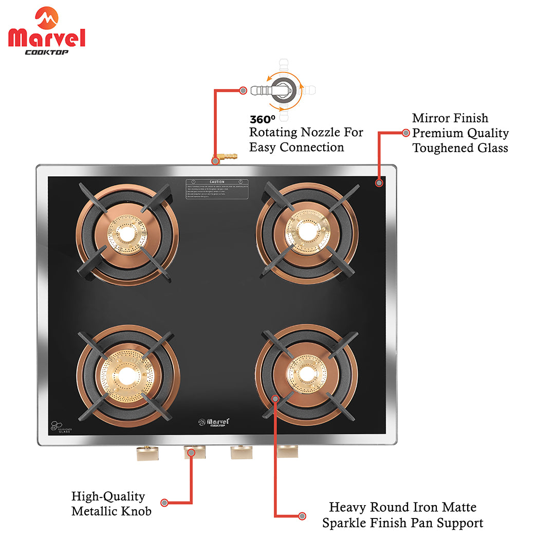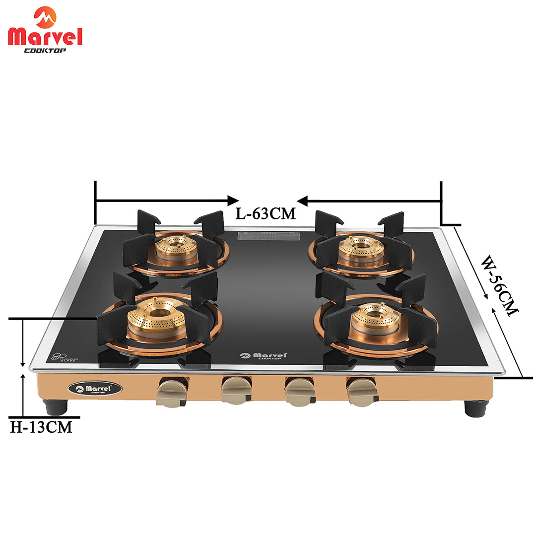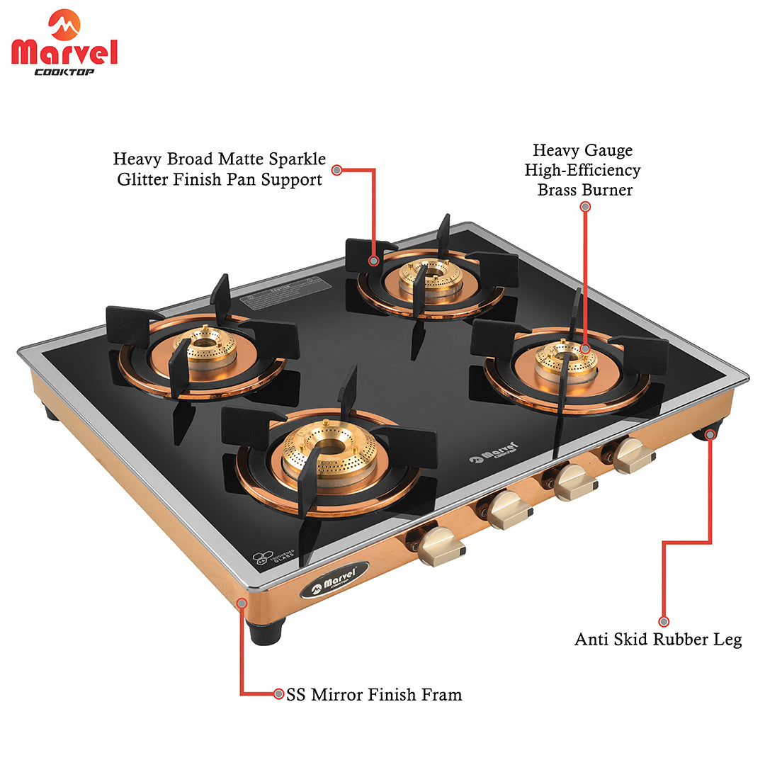 कुकटॉप मार्वल - 4 बर्नर प्रीमियम ग्लास गैस स्टोव | साइड मिरर ग्लास, रोज़ गोल्ड SS मिरर फ़्रेम, गोल पैन सपोर्ट | पीतल का टॉप, मैन्युअल इग्निशन, LPG कम्पैटिबल (WEGO - 4501)