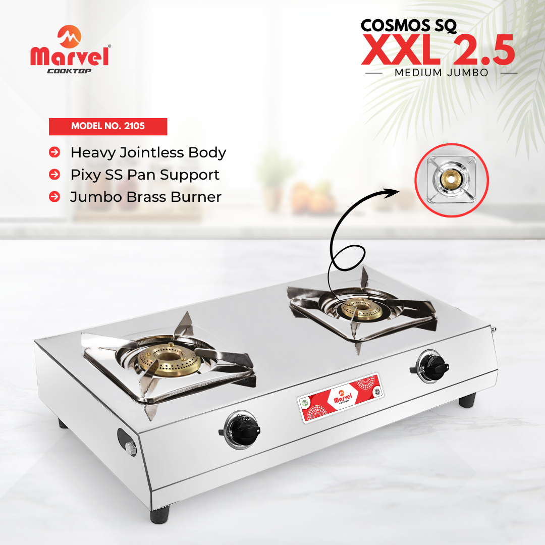 Cooktop Marvel - 2 Burner XXL Pixy Stainless Steel Gas Stove, Jointless Body, SS Square Pan Support, Jumbo Brass Top (COSMOS SQ - 2105)
