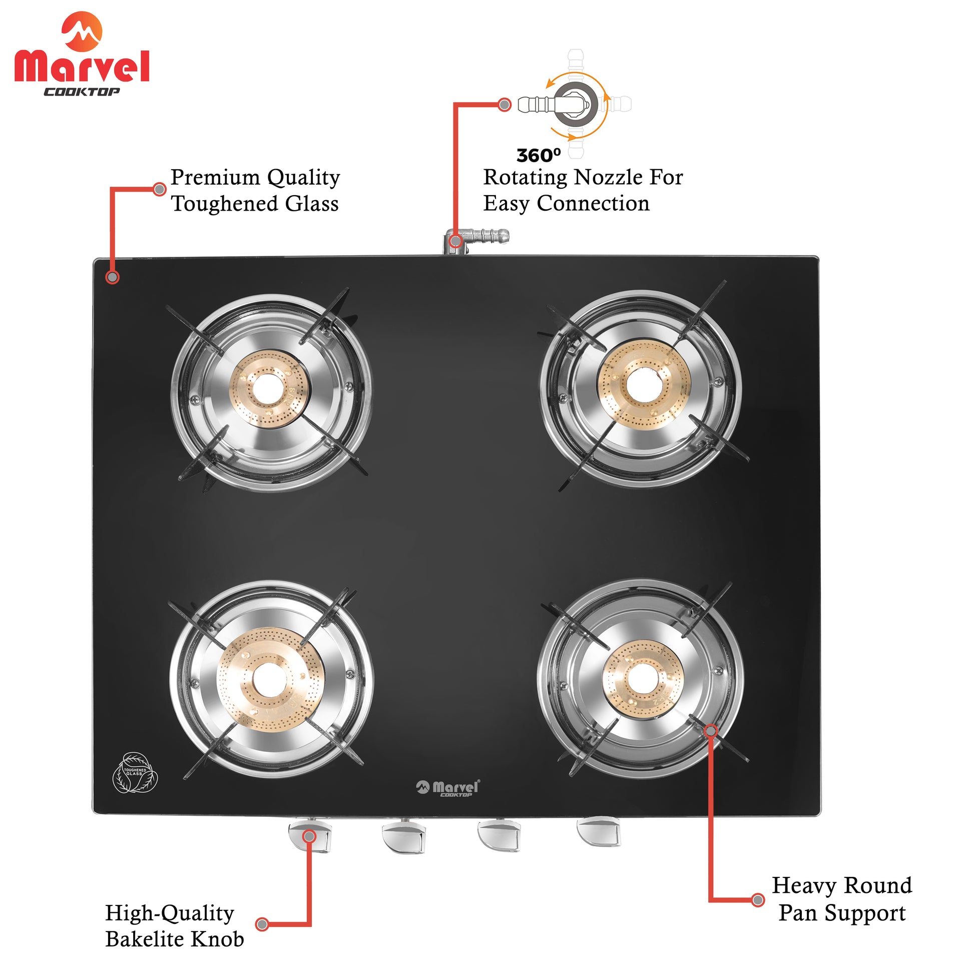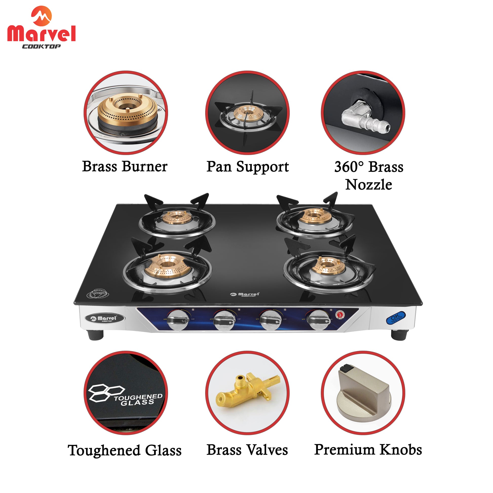 Cooktop Marvel – 4 Burner Gas Stove | Crystal Black Glass, SS Frame | Jumbo Brass Burner | Manual Ignition, LPG Compatible (PHASTOS SS – 4403)