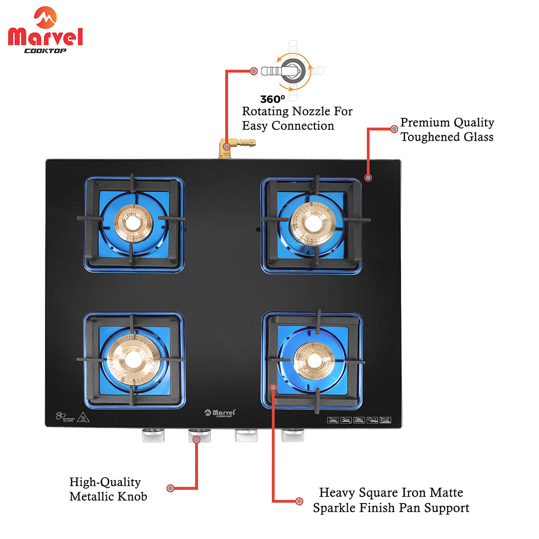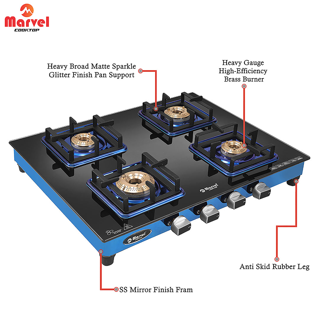 Cooktop Marvel – 4 Burner Premium Glass Gas Stove | Crystal Black Glass, Blue SS Mirror Frame, Square Pan Support | Brass Top, Manual Ignition, LPG Compatible (DOOM – 4502)
