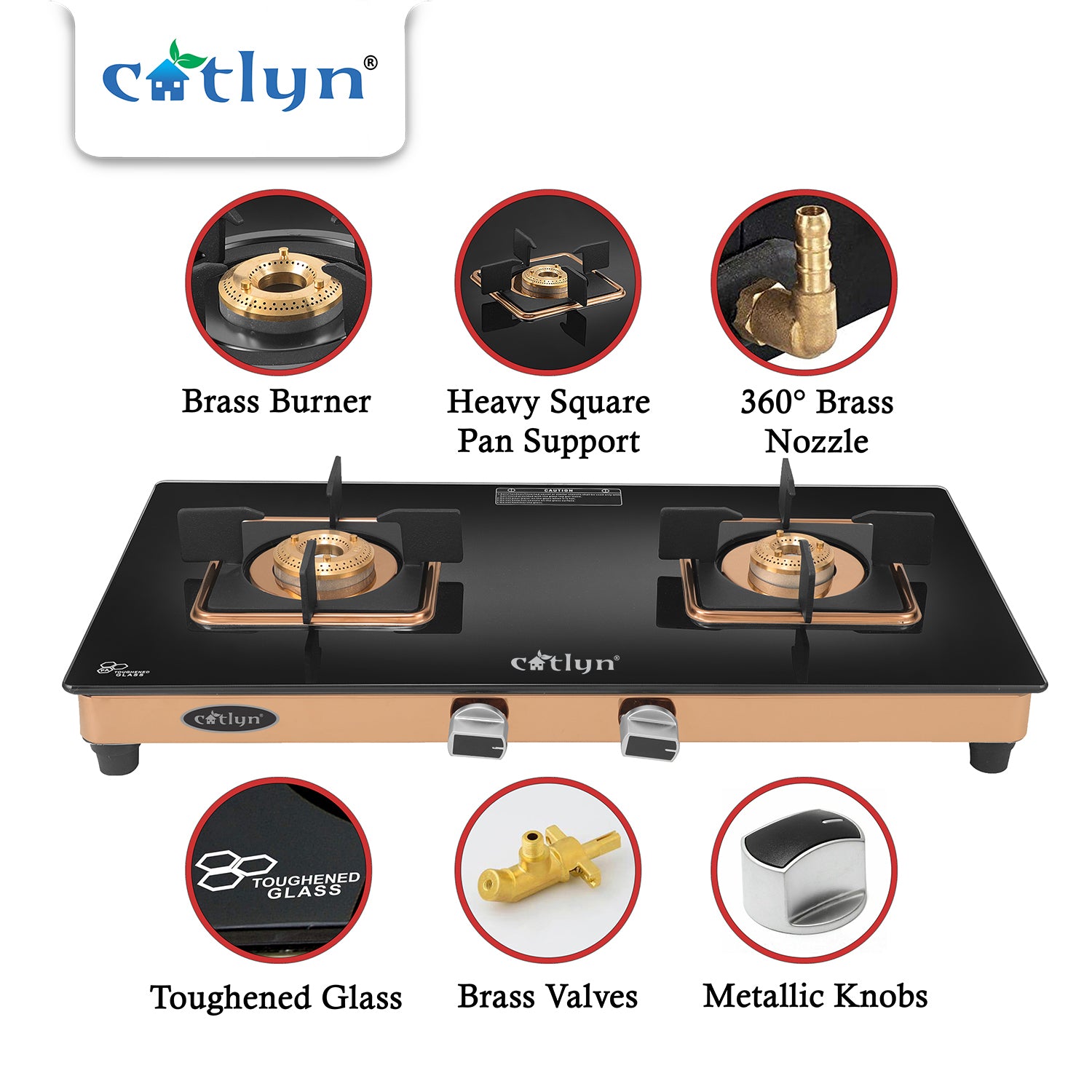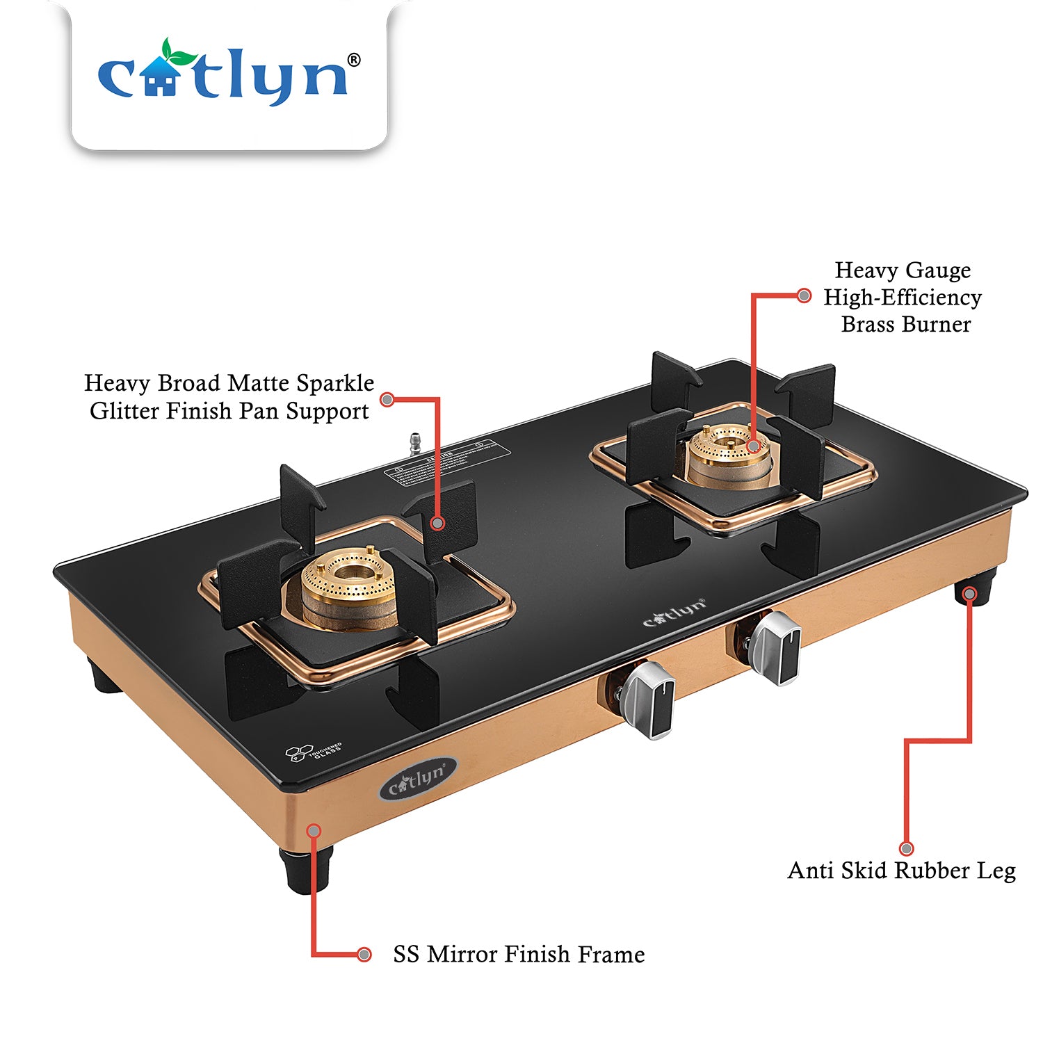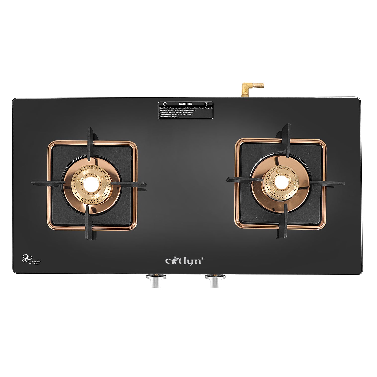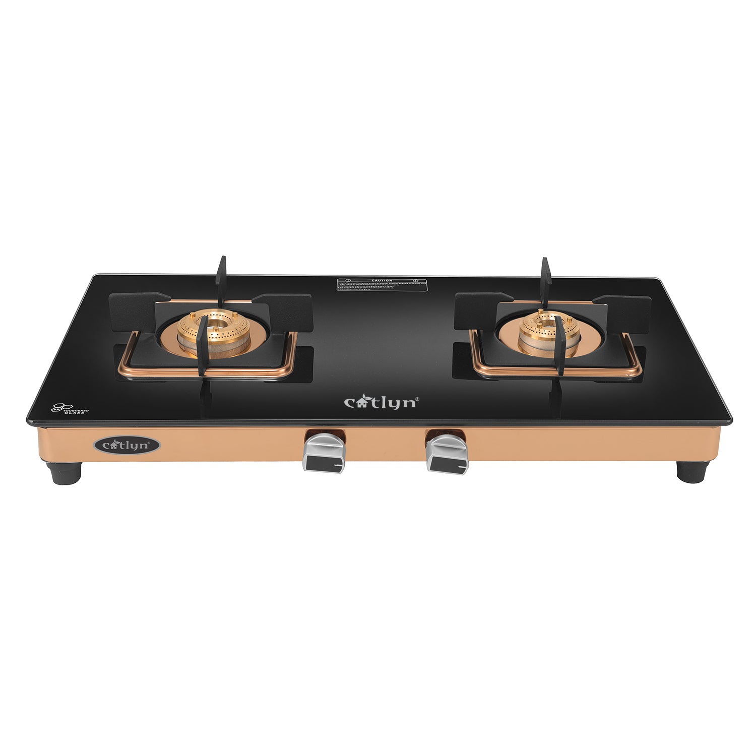 Catlyn - 2 Burner Crystal Black Glass Gas Stove with Rose Gold SS Mirror Finish Frame, Square Pan Support, Brass Top (DOOM - 2502)